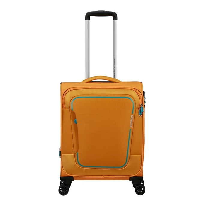 Op zoek naar een zachte koffer die geschikt is als handbagage? Dan is deze zachte koffer van American Tourister uit de Pulsonic serie wellicht precies waar je naar op zoek bent. Deze zachte koffer is gemaakt van polyester en op deze American Tourister koffer krijg je 2 jaar garantie. Het grote voordeel van een handbagage koffer ten opzichte van een ruimbagagekoffer is de snelheid en het gemak van je reis. Geen eindeloze wachtrij bij de incheckbalie voorafgaand van je vlucht en niet wachten op je koffer bij de bagageband op het vliegveld van bestemming. Deze American Tourister koffer is voorzien van 4 wielen en wordt daarom ook wel een spinner koffer genoemd. Ten opzichte van een koffer met 2 wielen is een spinner koffer wendbaarder en kun je deze rechtop laten staan tijdens het vervoeren.