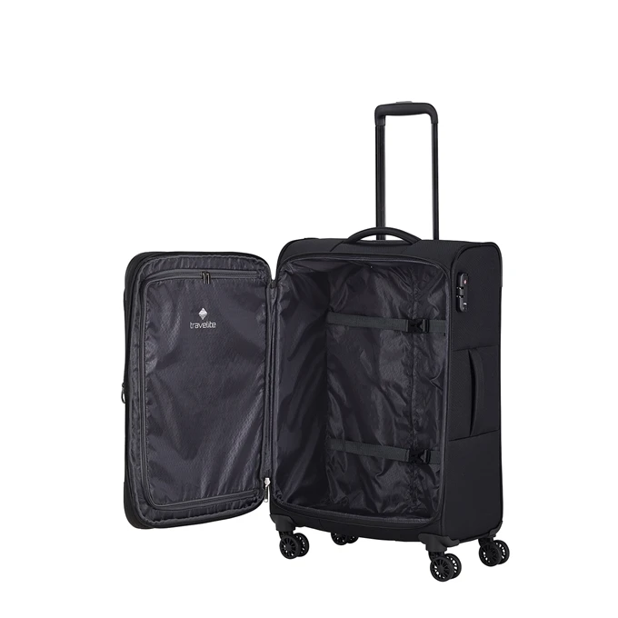 Ben je op zoek naar een koffer die voldoende ruimte biedt voor al jouw bagage? Dan is deze Travelite zachte koffer iets voor jou. Deze koffer is geschikt als ruimbagage koffer. Dit betekent dat je deze koffer niet zelf mee mag nemen aan boord als handbagage, maar ingecheckt wordt als ruimbagage op het vliegveld. Op deze Travelite koffer krijg je 2 jaar garantie en de koffer is gemaakt van polyester. De koffer heeft 4 wielen; koffers met 4 wielen hebben meer stabiliteit en zijn wendbaarder dan koffers met 2 wielen. Ga je ongeveer 1 tot maximaal 2 weken op vakantie, dan is deze koffer met een inhoud van 66 liter perfect. Als je weinig bagage meeneemt, dan is een vakantie van drie weken ook wel mogelijk, maar over het algemeen is een koffer met een inhoud van minimaal 95 liter aan te bevelen.