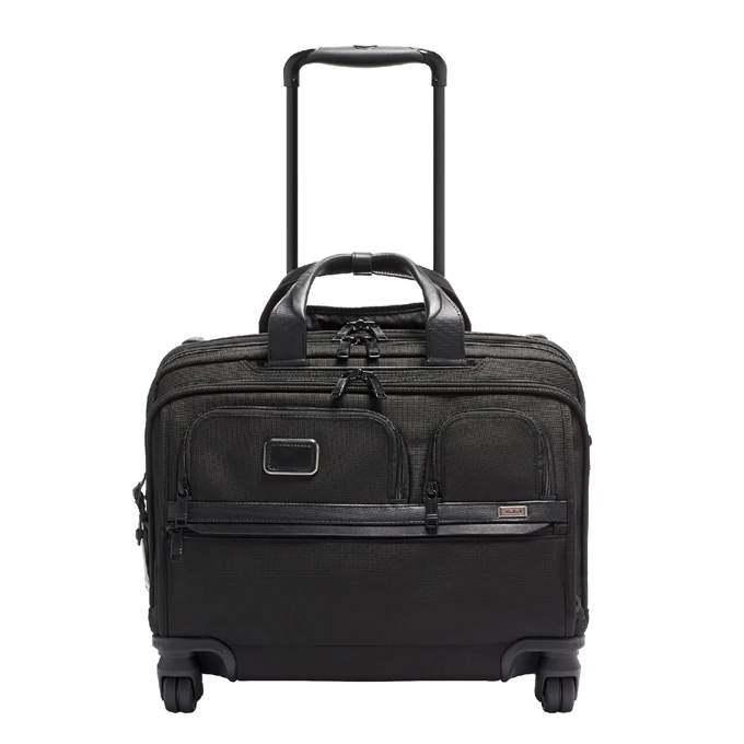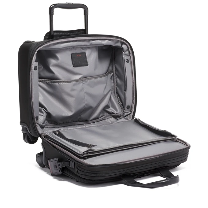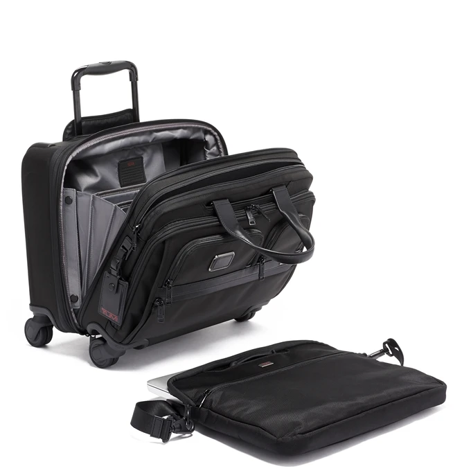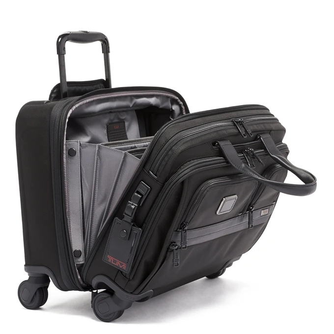 Op zoek naar een zachte koffer die geschikt is als handbagage en waar jouw laptop in kan? Dan is deze zachte koffer van Tumi uit de Alpha serie wellicht precies waar je naar op zoek bent. Deze zachte koffer is gemaakt van leer en op deze Tumi koffer krijg je 5 jaar garantie. Het grote voordeel van een handbagage koffer ten opzichte van een ruimbagagekoffer is de snelheid en het gemak van je reis. Geen eindeloze wachtrij bij de incheckbalie voorafgaand van je vlucht en niet wachten op je koffer bij de bagageband op het vliegveld van bestemming. De koffer is voorzien van een apart compartiment voor je laptop. Zo neem je je laptop veilig mee tijdens je reis. Je kunt maximaal een laptop kwijt van 17″. Omdat deze Tumi koffer voorzien is van 4 wielen, is de koffer wendbaar en stabiel. Ten opzichte van koffers met 2 wielen is het minder zwaar om de koffer te vervoeren, omdat deze rechtop kan blijven staan.